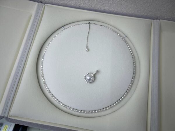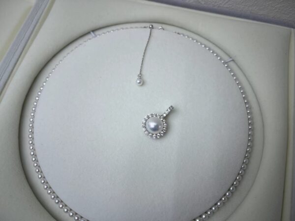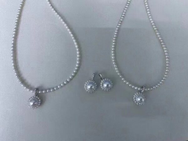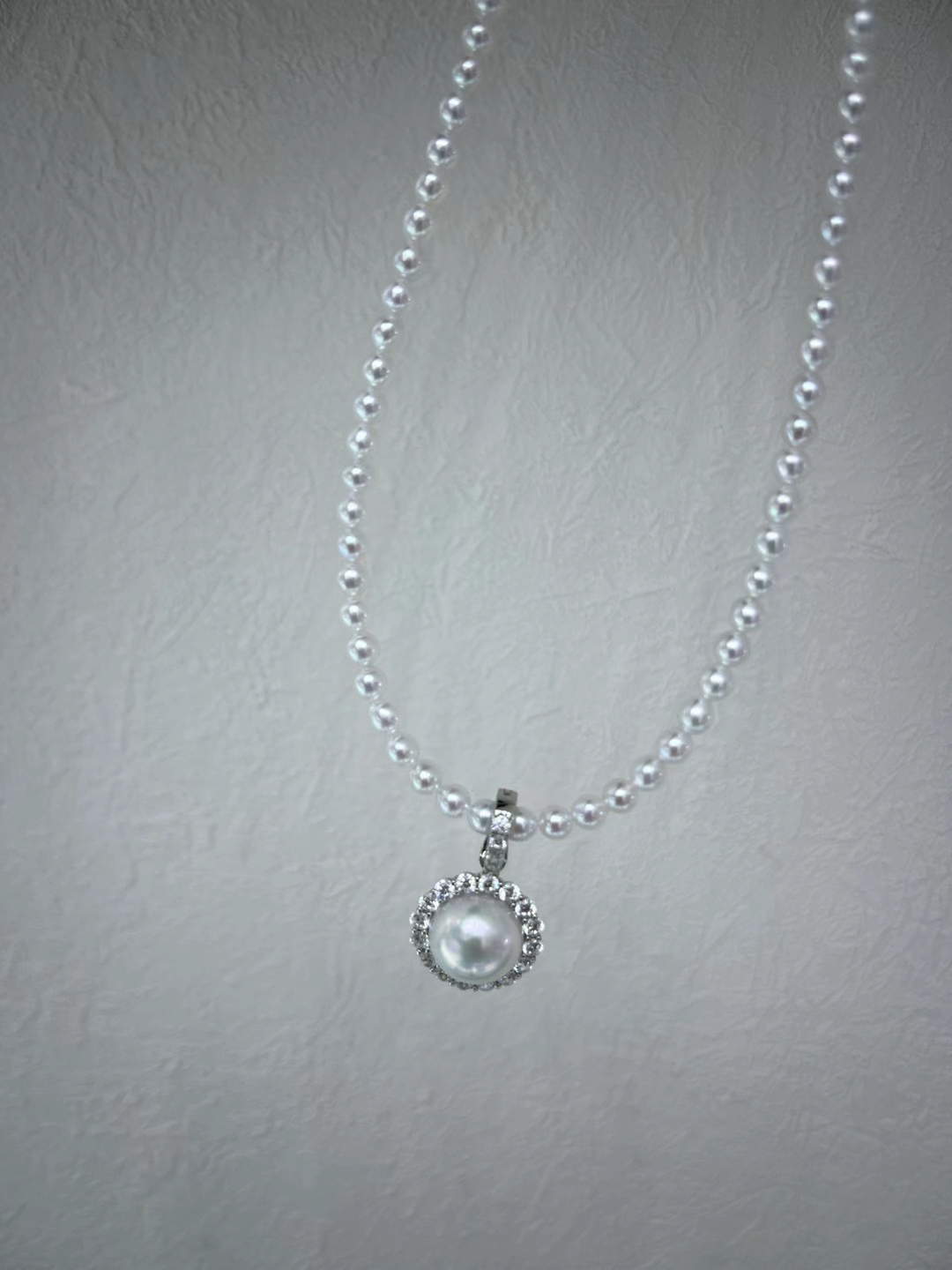 The Diana style pearl chain is a timeless piece of jewelry that embodies elegance and sophistication. The 10mm main pearl is typically of high quality, with a smooth surface and a subtle iridescence that catches the light beautifully.The melee diamonds around the main pearl make the pearl larger. This classic pearl chain can be worn as a standalone piece for a minimalist look or layered with other necklaces for a more statement-making style. It’s perfect for both casual and formal occasions, making it a staple in any jewelry collection.
