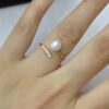 The open design of the ring allows for a more modern and airy aesthetic, with the sides of the band not fully enclosing the pearl, which can create an illusion of it floating on the finger. This design choice also provides the wearer with the flexibility to adjust the ring to fit comfortably on their finger.